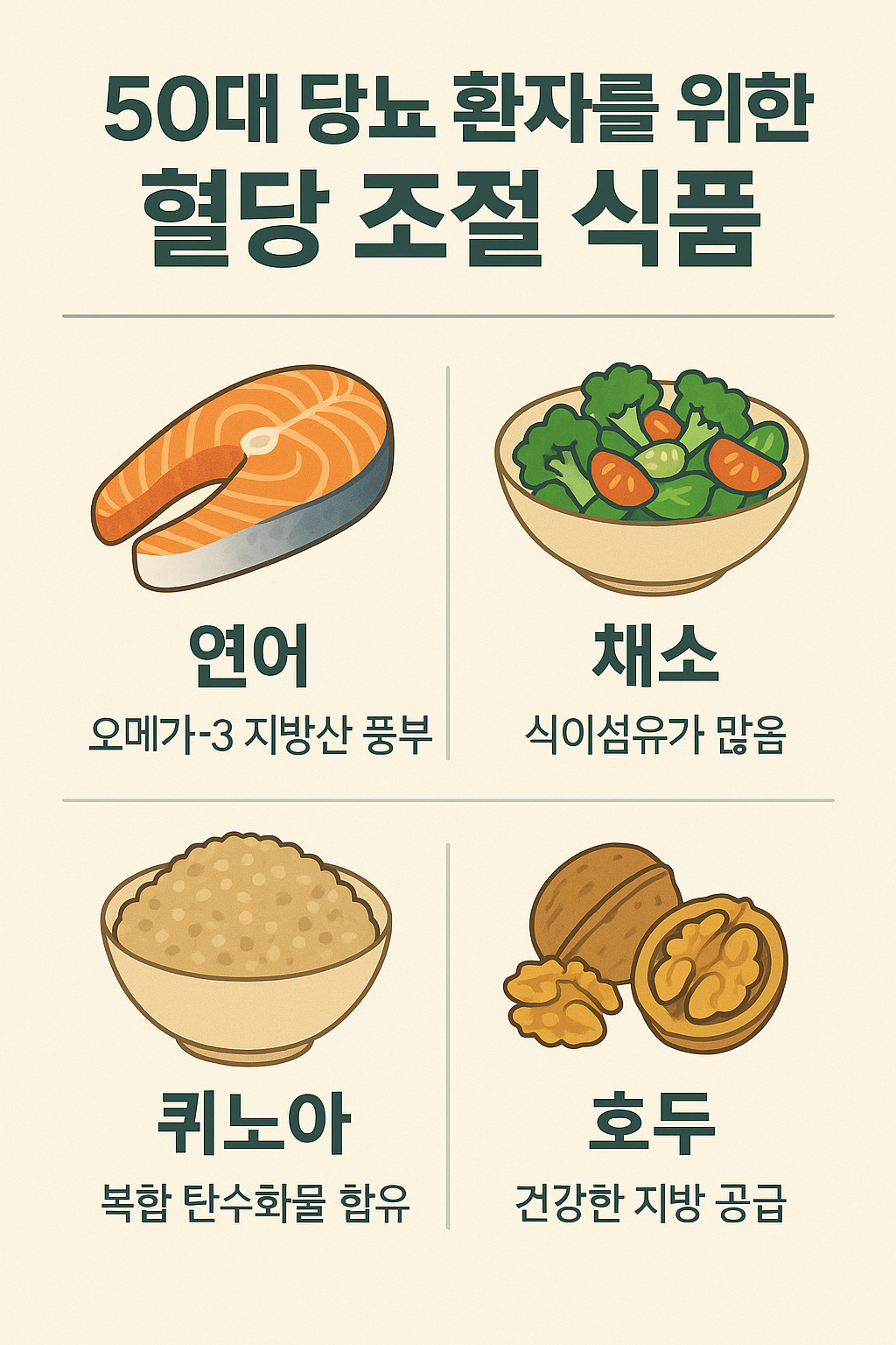50대에 접어들면서 당뇨병 관리는 더욱 중요해집니다. 특히 혈당 조절은 합병증 예방과 삶의 질 향상을 위해 필수적입니다. 이 글에서는 50대 당뇨 환자가 섭취하면 좋은 혈당 조절 식품을 중심으로, 그 식품들이 혈당에 미치는 영향과 올바른 식습관 형성법을 자세히 설명합니다. 또한 식품 선택 시 주의사항과 함께 건강한 생활습관도 함께 소개하여 당뇨 관리에 실질적인 도움이 되도록 하였습니다. 전문가의 시각에서 쉽게 이해할 수 있도록 풀어 쓴 글입니다.
